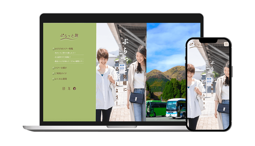 - イラストやアニメーション:楽しさや親しみやすさを演出できるよう、トップページにスクロールしたら木のイラストの間をバスが動くアニメーション、さらに、スクロールに応じて右・左・下からコンテンツがふわっと現れるアニメーションを実装。視覚的な動きを加えることで、旅への期待感やサイトの楽しさを自然と演出した。